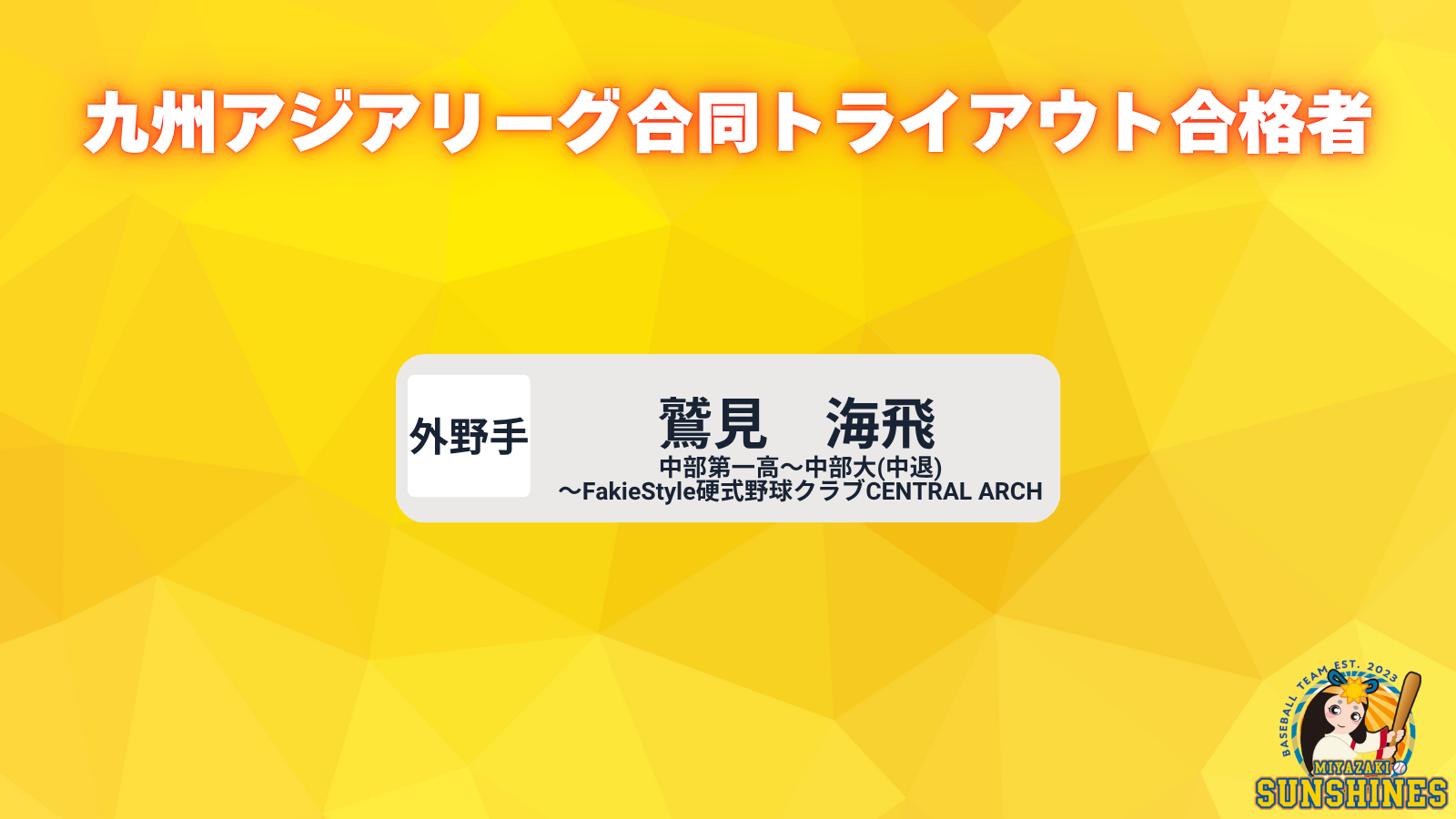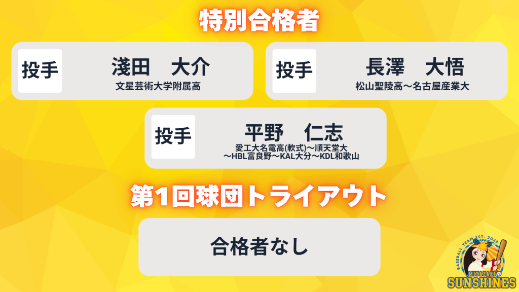宮崎サンシャインズでは、各トライアウト等合格者が決定しましたのでお知らせいたします。