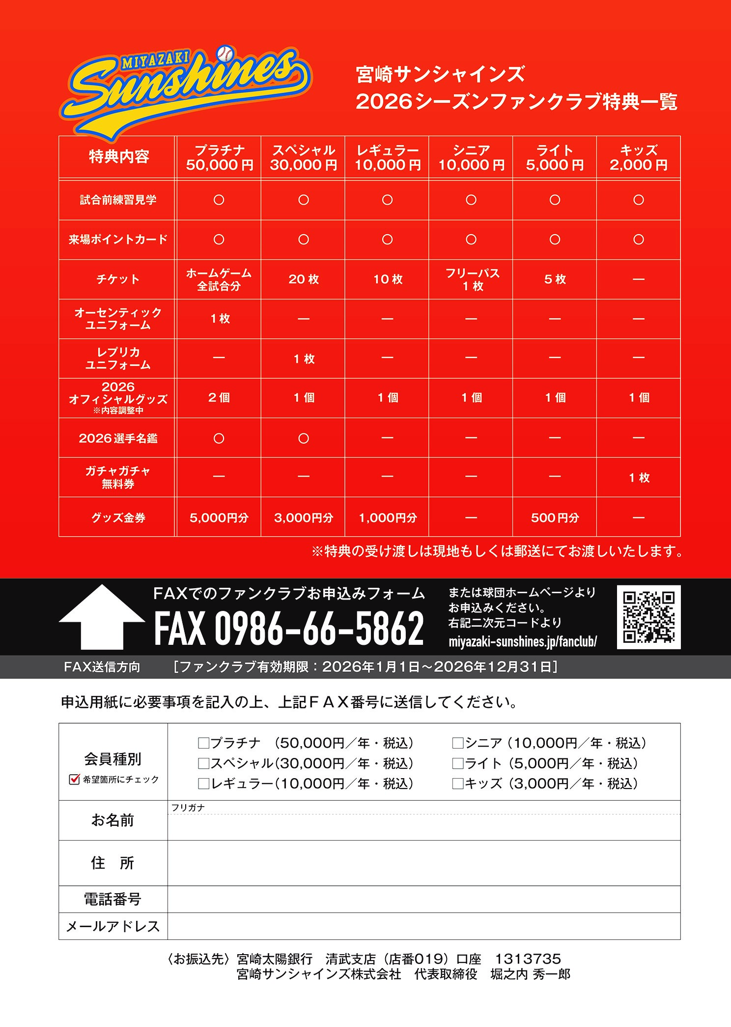 2026年シーズン「宮崎サンシャインズファンクラブ」会員募集受付開始いたしました!