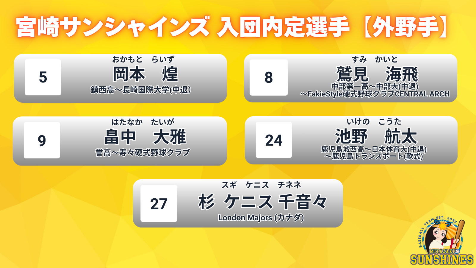 宮崎サンシャインズでは、昨年行い各トライアウトの合格者・特別合格者及び移籍選手と入団交渉を行い、下記21選手が契約合意となりましたのでお知らせいたします。