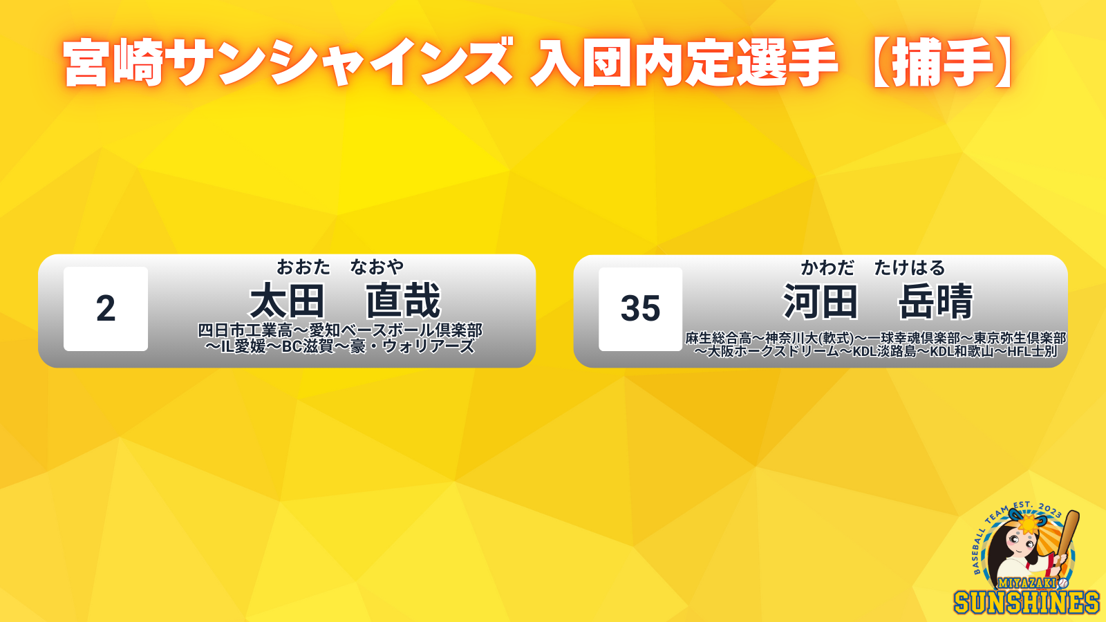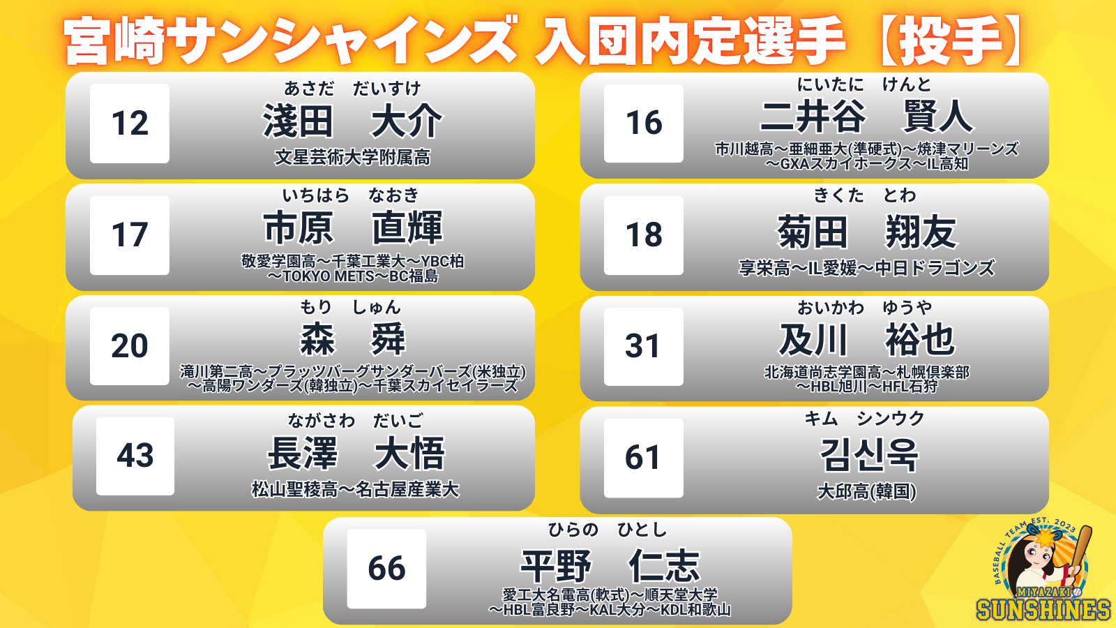 宮崎サンシャインズでは、昨年行い各トライアウトの合格者・特別合格者及び移籍選手と入団交渉を行い、下記21選手が契約合意となりましたのでお知らせいたします。